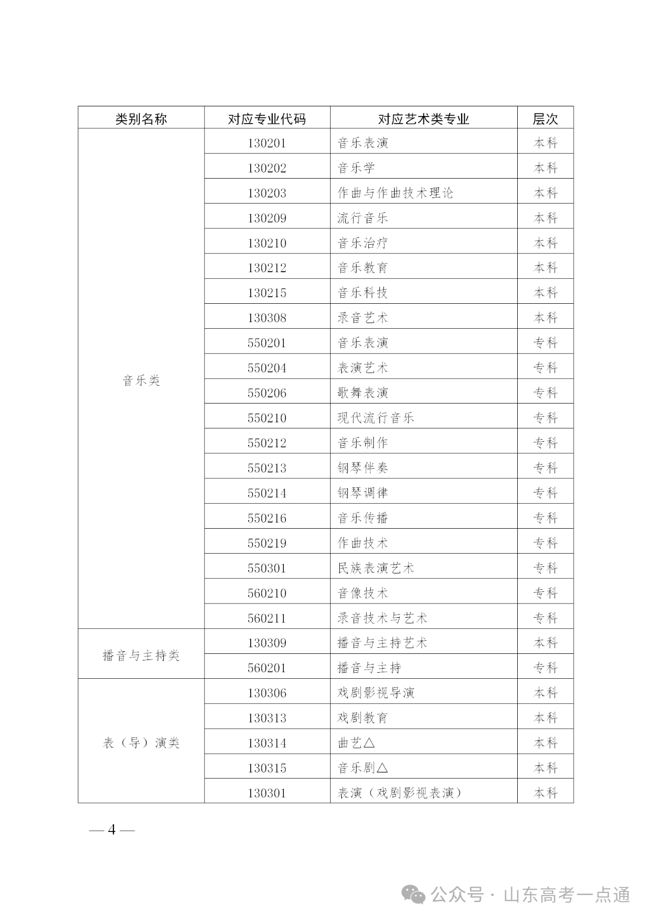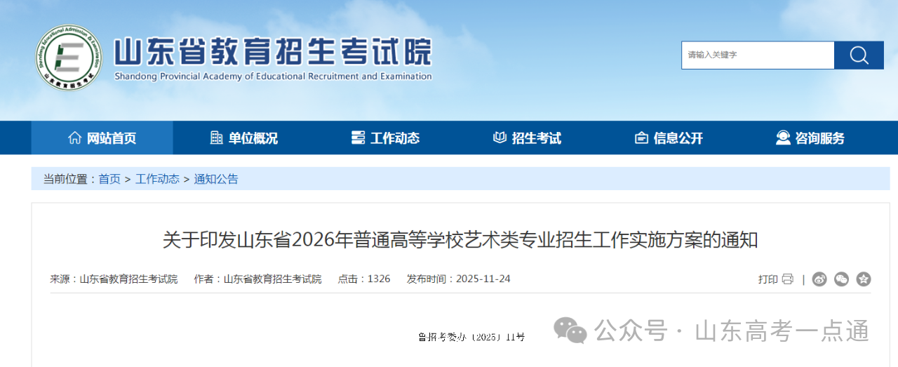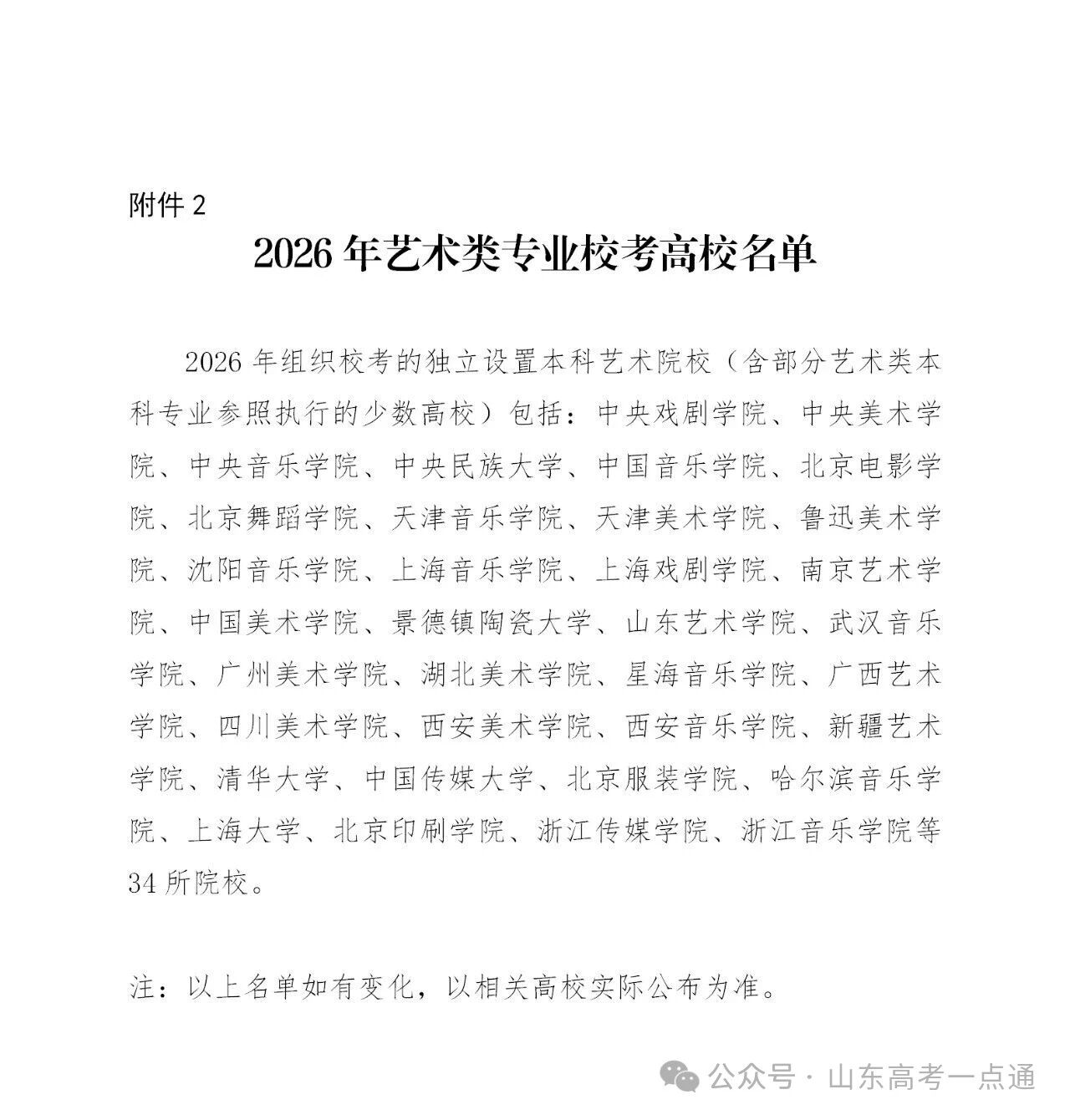 刚刚,山东省教育招生考试院发布了《关于印发山东省2026年普通高等学校艺术类专业招生工作实施方案的通知》,其中一个重大变化是:艺术类本科批和专科批省级统考专业(使用省级统考成绩)均实行平行志愿,1个“专业(专业类)+学校”为1个志愿,考生每次填报志愿的数量不超过96个,可以填满所有志愿,也可选择填报部分志愿。具体内容一起来看~ 关于印发山东省2026年普通高等学校艺术类专业招生工作实施方案的通知 鲁招考委办〔2025〕11号 各市招生(考试)委员会,各高等学校: 现将《山东省2026年普通高等学校艺术类专业招生工作实施方案》印发给你们,请遵照执行。 山东省招生考试委员会办公室 (山东省教育厅代章) 2025年11月21日 山东省2026年普通高等学校艺术类专业招生工作实施方案 为规范实施山东省2026年普通高等学校艺术类专业招生工作,公平、公正选拔艺术类专业人才,根据教育部部署,结合我省实际,制定本实施方案。 一、招生类别与计划管理 (一)山东省艺术类招生专业划分为美术与设计类、书法类、舞蹈类、音乐类、播音与主持类、表(导)演类、戏曲类等7个类别。原则上高校同一艺术类专业只能对应一个省级统考专业类别,且在各招生省份保持一致。高校应在规定时间公布招生专业及对应专业类别、录取要求等信息。 (二)山东省2026年普通高等学校招生考生号第9位的科类代码“3”为艺术类考生标识。除少数经教育部批准组织校考的专业和省际联考的戏曲类本科专业不编制分省计划外,其他艺术类专业均须编制分省分专业招生计划。高校设立招考方向的艺术类专业,须编制各招考方向的分省招生计划。录取期间,校考专业(招考方向)未完成的计划,不得调整至其他校考专业(招考方向)。未经教育部批准的艺术类专业,不得编制艺术类招生来源计划。 二、专业考试及成绩使用 山东省2026年艺术类专业考试分为省级统考、省际联考和高校校考。未经教育部批准的艺术类专业,不得组织专业考试。原则上考生限选一类艺术专业报考,录取阶段同一批次也只能选择一类艺术专业填报志愿和参与录取。 (一)省级统考。 山东省教育招生考试院负责组织2026年山东省美术与设计类、书法类、舞蹈类、音乐类、播音与主持类、表(导)演类省级统考工作。 1.省级统考时间及科目分值。 美术与设计类、书法类、音乐类、表(导)演类笔试科目考试时间为2025年12月6日至12月7日;播音与主持类、舞蹈类、音乐类、表(导)演类面试科目考试(含录制)时间为2025年12月17日至24日,各类别具体结束时间以考试编场时间为准。 美术与设计类考试科目:速写(综合能力)满分100分,素描满分100分,色彩满分100分,总分满分为300分。 书法类考试科目:书法临摹满分150分,书法创作满分150分,总分满分为300分。 舞蹈类分为中国舞、芭蕾舞、国际标准舞、现代舞、流行舞5个舞种方向,考生自主选择1个方向报考。舞蹈类考试科目:舞蹈基本功、舞蹈表演、舞蹈即兴3个科目,每科目按照满分100分评分,总成绩=舞蹈基本功×120%+舞蹈表演×150%+舞蹈即兴×30%,总分满分为300分。 音乐类分为乐理、听写、视唱、声乐、器乐5个科目,考生可从声乐、器乐2个科目中,自主选择1个或2个科目报考,并各自准确选择1种专业技能项目名称。后续将依据招生高校要求和考生报名时选择的声乐、器乐技能项目进行录取。选择报考1个科目的考生,仅生成音乐表演(器乐)或音乐表演(声乐)1项专业成绩;选择报考2个科目的考生,可生成音乐表演(器乐)、音乐表演(声乐)、音乐教育3项专业成绩。 音乐表演(器乐)考试科目:乐理、听写、视唱、器乐4个科目,每科目按照满分100分评分,总成绩=乐理×15%+听写×30%+视唱×15%+器乐×240%,总分满分为300分。 音乐表演(声乐)考试科目:乐理、听写、视唱、声乐4个科目,每科目按照满分100分评分,总成绩=乐理×15%+听写×30%+视唱×15%+声乐×240%,总分满分为300分。 音乐教育考试科目:乐理、听写、视唱、器乐、声乐5个科目,每科目按照满分100分评分,器乐、声乐分主、副项,成绩高者默认为主项,成绩低者默认为副项,总成绩=乐理×15%+听写×30%+视唱×15%+主项×165%+副项×75%,总分满分为300分。 播音与主持类考试科目:作品朗读、新闻播报、话题评述3个科目,每科目按照满分100分评分,总分满分为300分。 表(导)演类分为戏剧影视表演、戏剧影视导演、服装表演3个方向,考生可选择服装表演方向或从戏剧影视表演、戏剧影视导演2个方向中,自主选择1个或2个方向报考,相同考试科目仅考1次。 表(导)演类(戏剧影视表演方向)考试科目:文学作品朗诵、自选曲目演唱、形体技能展现、命题即兴表演4个科目,每科目按照满分100分评分,总成绩=文学作品朗诵+自选曲目演唱×50%+形体技能展现×50%+命题即兴表演,总分为满分300分。 表(导)演类(戏剧影视导演方向)考试科目:文学作品朗诵、命题即兴表演、叙事性作品写作3个科目,每科目按照满分100分评分,总成绩=文学作品朗诵×50%+命题即兴表演×50%+叙事性作品写作×200%,总分为满分300分。 表(导)演类(服装表演方向)考试科目:形体形象观测、台步展示、才艺展示3个科目,每科目按照满分100分评分,总成绩=形体形象观测×150%+台步展示×120%+才艺展示×30%,总分为满分300分。 2.考试组织形式。 2026年我省艺术类专业省级统考美术与设计类、书法类专业采取笔试形式;音乐
