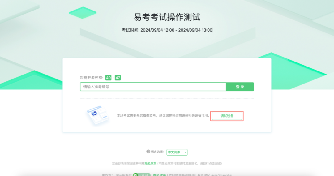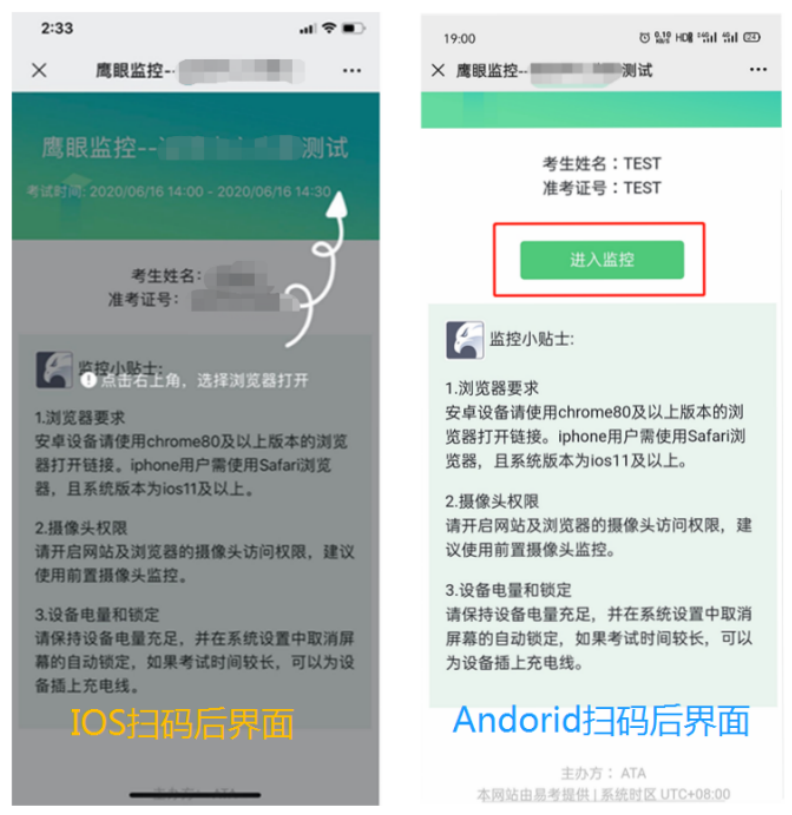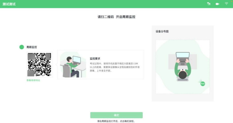 云监考(鹰眼)监控设备架设好以后,可以使用前置摄像头的拍照功能,查看监控效果、调试监控角度,确保监控摄像头无遮挡、设备架设稳定,监控范围应覆盖考生上半身(双手可见)、考试设备、答题设备的屏幕、书桌以及考生周边环境。
