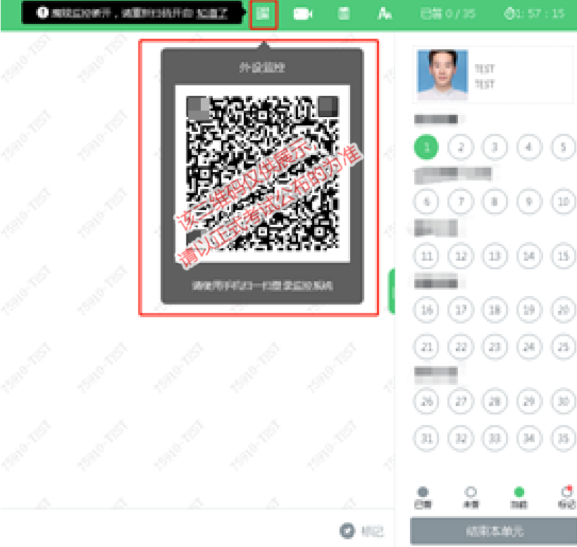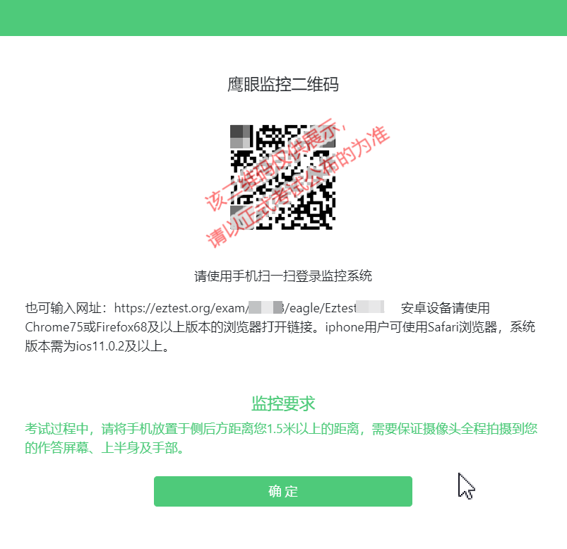 准考证打印:2月27日-3月3日,登录我校官网(www.hx.cn)进行准考证打印,考生须仔细阅读学习准考证相关内容。 或点击下方链接:http://lzsgl.hx.cn/2015/luquxinxichaxun/ZKZDL.aspx 测试地址 模拟测试地址:(2月28日9:00-17:00) https://eztest.org/exam/session/405741/ 正式测试地址: 3月1日、3月4日,考生可结合个人实际情况,自主选择其中一天报考,具体考试时间以准考证为准。 https://eztest.org/exam/session/405756/ https://eztest.org/exam/session/406143/ https://eztest.org/exam/session/405763/ https://eztest.org/exam/session/406128/ https://eztest.org/exam/session/405757/ 车辆工程(3月4日9:00-10:00) https://eztest.org/exam/session/406144/ https://eztest.org/exam/session/405783/ https://eztest.org/exam/session/406145/ https://eztest.org/exam/session/405772/ https://eztest.org/exam/session/406153/ 电气工程及其自动化(3月1日15:00-16:00) https://eztest.org/exam/session/405779/ 电气工程及其自动化(3月4日15:00-16:00) https://eztest.org/exam/session/406161/ https://eztest.org/exam/session/405780/ https://eztest.org/exam/session/406162/ https://eztest.org/exam/session/405758/ https://eztest.org/exam/session/406146/ 房地产开发与管理(3月1日10:00-11:00) https://eztest.org/exam/session/405764/ 房地产开发与管理(3月4日10:00-11:00) https://eztest.org/exam/session/406130/ 工程造价(3月1日14:00-15:00) https://eztest.org/exam/session/405773/ 工程造价(3月4日14:00-15:00) https://eztest.org/exam/session/406155/ https://eztest.org/exam/session/405781/ https://eztest.org/exam/session/406163/ 康复治疗学(3月1日9:00-10:00) https://eztest.org/exam/session/405759/ 康复治疗学(3月4日9:00-10:00) https://eztest.org/exam/session/406147/ 护理学(3月1日10:00-11:00) https://eztest.org/exam/session/405765/ 护理学(3月4日10:00-11:00) https://eztest.org/exam/session/406131/ 健康服务与管理(3月1日14:00-15:00) https://eztest.org/exam/session/405774/ 健康服务与管理(3月4日14:00-15:00) https://eztest.org/exam/session/406156/ 学前教育(3月1日9:00-10:00) https://eztest.org/exam/session/405760/ 学前教育(3月4日9:00-10:00) https://eztest.org/exam/session/406148/ 酒店管理(3月1日10:00-11:00) https://eztest.org/exam/session/405766/ 酒店管理(3月4日10:00-11:00) https://eztest.org/exam/session/406132/ 会展经济与管理(3月1日14:00-15:00) https://eztest.org/exam/session/405775/ 会展经济与管理(3月4日14:00-15:00) https://eztest.org/exam/session/406157/ https://eztest.org/exam/session/405782/ https://eztest.org/exam/session/406164/ 汉语言文学(3月1日10:00-11:00) https://eztest.org/exam/session/405767/ 汉语言文学(3月4日10:00-11:00) https://eztest.org/exam/session/406133/ 金融工程(3月1日9:00-10:00) https://eztest.org/exam/session/405761/ 金融工程(3月4日9:00-10:00) https://eztest.org/exam/session/406149/ 工商管理(3月1日10:00-11:00) https://eztest.org/exam/session/405768/ 工商管理(3月4日10:00-11:00) https://eztest.org/exam/session/406134/ 会计学(3月1日10:00-11:00) https://eztest.org/exam/session/405769/ 会计学(3月4日10:00-11:00) https://eztest.org/exam/session/406135/ 人力资源管理(3月1日14:00-15:00) https://eztest.org/exam/session/405776/ 人力资源管理(3月4日14:00-15:00) https://eztest.org/exam/session/406158/ 物流工程(3月1日14:00-15:00) https://eztest.org/exam/session/405777/ 物流工程(3月4日14:00-15:00) https://eztest.org/exam/session/406159/ 人工智能(3月1日9:00-10:00) https://eztest.org/exam/session/405749/ 人工智能(3月4日9:00-10:00) https://eztest.org/exam/session/406150/ https://eztest.org/exam/session/405770/ https://eztest.org/exam/session/406136/ 网络工程(3月1日14:00-15:00) https://eztest.org/exam/session/405778/ 网络工程(3月4日14:00-15:00) https://eztest.org/exam/session/406160/ 印刷工程(3月1日9:00-10:00) https://eztest.org/exam/session/405762/ 印刷工程(3月4日9:00-10:00) https://eztest.org/exam/session/406151/ 视觉传达设计(3月1日10:00-11:00) https://eztest.org/exam/session/405771/ 视觉传达设计(3月4日10:00-11:00) https://eztest.org/exam/session/406137/ 服装与服饰设计(3月1日10:00-11:00) https://eztest.org/exam/session/405784/ 服装与服饰设计(3月4日10:00-11:00) https://eztest.org/exam/session/406140/ 数字媒体艺术(3月1日10:00-11:00) https://eztest.org/exam/session/405785/ 数字媒体艺术(3月4日10:00-11:00) https://eztest.org/exam/session/406141/ 青岛恒星科技学院2026年普通专升本 专业综合能力测试技术指引 笔试考试为在线考试形式,考生自行准备符合要求的考试设备、监控设备和场地参加线上考试。考试全程同时开启两路在线视频监控,进行远程在线监考。以下就考试设备要求、在线考试操作流程以及如何搭建第二视角云监考(鹰眼)监控等具体操作进行说明。 一、笔试考试设备 1.用于考试答题的设备 笔试考试通过“易考在线考试系统”网页版进行,用于答题的考试设备优先推荐使用台式或笔记本电脑(作答界面显示更加完善),考试也支持智能手机作答。 使用电脑要求: (1)电脑操作系统要求:Win7、Win10或Mac OS 10.15.7及以上操作系统; (2)CPU 双核,内存4G及以上,硬盘剩余空间2G以上; (3)浏览器要求:安装最新版谷歌(chrome)或者最新版Edge浏览器;或者使用华为手机自带浏览器; (4)考试用电脑具备可正常工作的摄像设备(内置或外置摄像头均可); 考试期间将全程使用摄像头,需确保电脑摄像头开启,无遮挡; (5)考试要求启用音频监控,考试设备还需具备可正常工作的音频输入设备; (6)如使用笔记本电脑请保持电量充足,建议全程使用外接电源; (7)为确保考试顺利进行,在进入考试系统前请关闭考试设备上与考试无关网页和软件,包括各类通讯软件以及音视频播放。彻底关闭尤