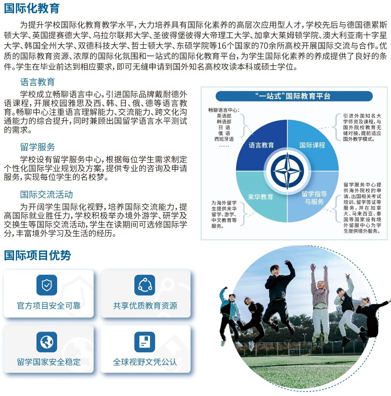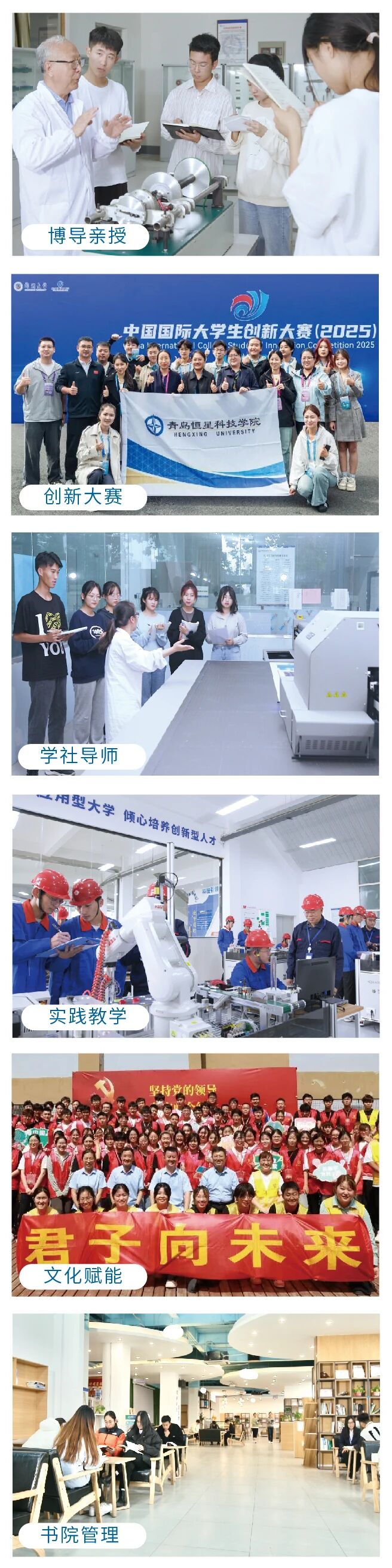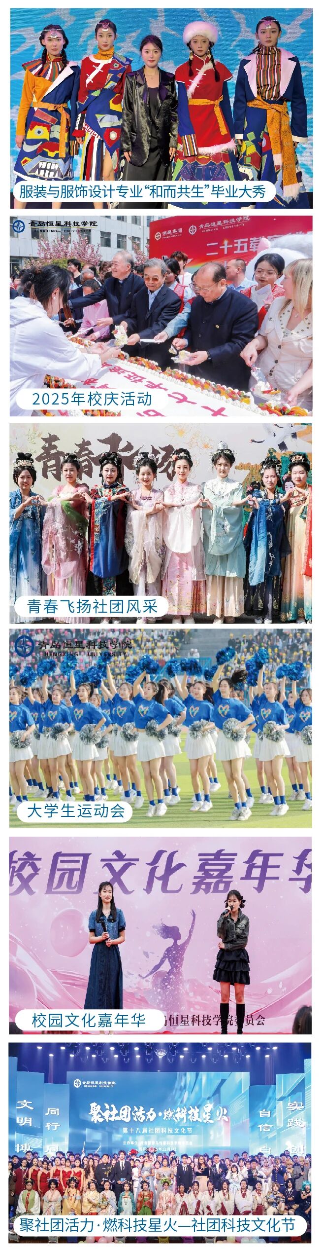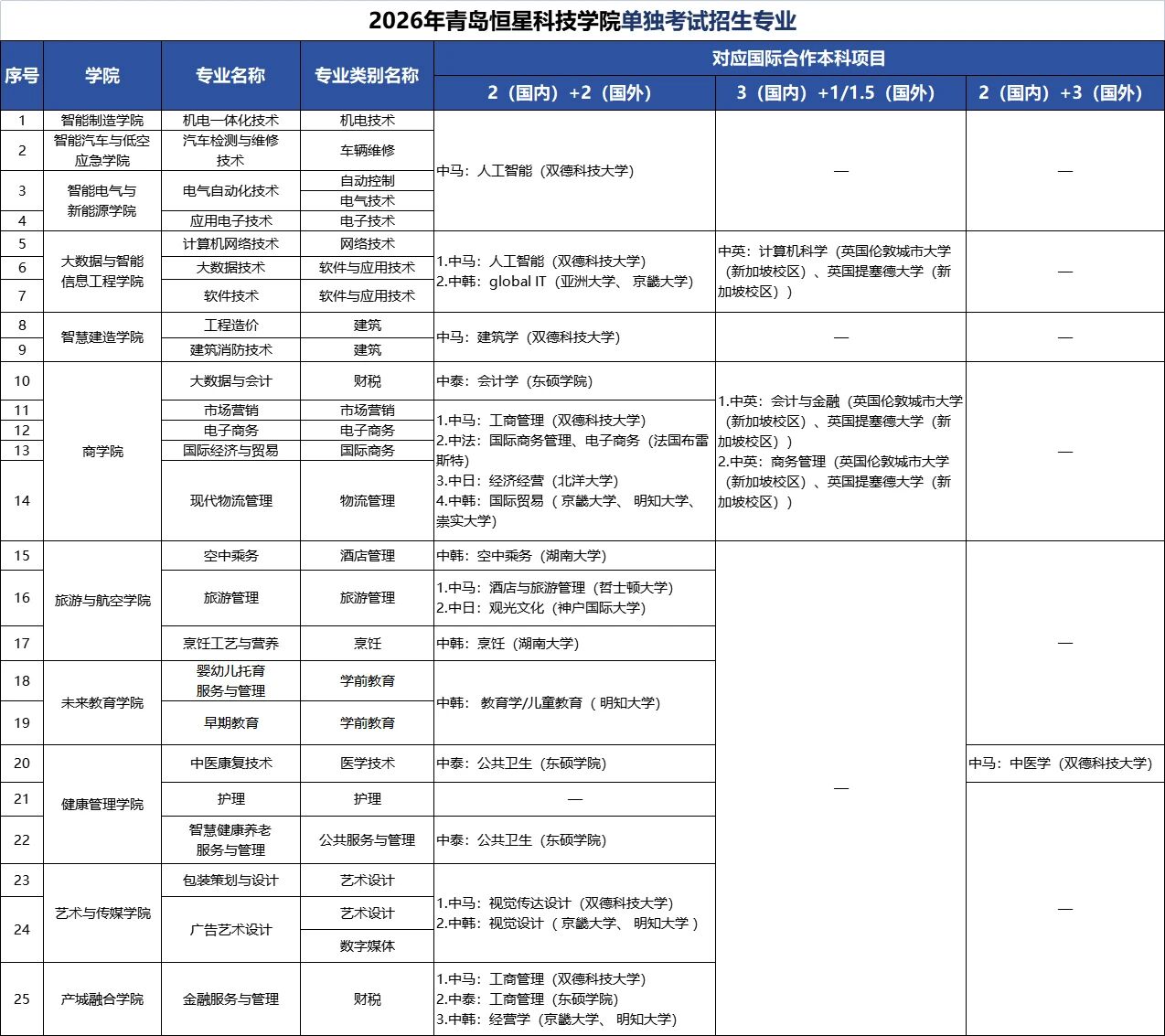 青岛恒星科技学院 2026年单招、综合评价招生简章 一、学校简介 青岛恒星科技学院创建于2000年,坐落在青岛腹地、崂山西麓,位于青岛市主城区东部高校园区的核心位置,是经教育部批准的全日制普通本科高校,现占地面积184余万平方米,校舍建筑面积80余万平方米,现有全日制在校生3.2万人。 学校设有智能制造学院、智能汽车与低空应急学院、智能电气与新能源学院、大数据与智能信息工程学院、智慧建造学院、商学院、旅游与航空学院、人文学院、国际教育学院、未来教育学院、体育学院、农学院、健康管理学院、艺术与传媒学院、产城融合学院、马克思主义学院等16个二级学院。现开设本科专业51个,高职专科专业38个,涵盖工学、管理学、艺术学等9个学科门类,形成了以工学、管理学为主,多学科协调发展的学科专业布局。目前学校建有3个省级一流本科专业,4个省民办本科高校优势特色专业。2021年学校入选山东省第二批应用型本科高校建设单位。 学校全面贯彻党的教育方针,坚持社会主义办学方向和公益性办学原则,坚持地方性、应用型办学定位。秉承“文明、博学、实践、创新”的校训,实施“质量立校、人才强校、特色兴校、创新活校”的发展战略,紧紧围绕国家和地方经济社会发展需要,落实立德树人根本任务,以教学为中心,以能力培养为重点,构建了“校企孪生齐相长”的办学模式,坚持五育并举,培养德智体美劳全面发展的高素质应用型人才。 根据应用型本科人才培养目标定位,塑造学生的思想品德、专业素养和综合素质,夯实基本理论、基本知识和基本技能,强化实践应用,培养专业能力、创新创业能力和分析解决复杂实际问题的综合能力,进一步夯实了以恒星“五优”人才标准(德行好、学力强、理论通、实战勤、国际化)为核心的“新君子”人才培养模式。 三、师资团队 四、学习环境 育人特色 教学条件 校园生活 五、招生专业 七、国际交流 八、联系方式 欢迎报考青岛恒星科技学院!